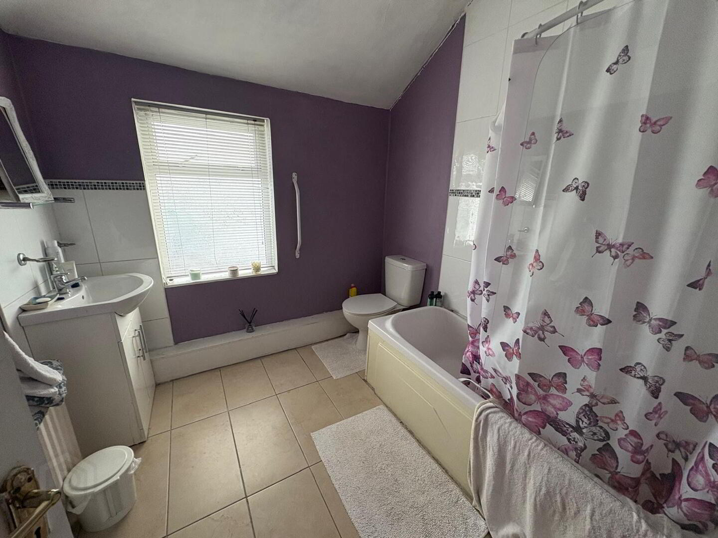 Bathroom- Tiled over bath & splashback with W.C., Wash-hand basin, Bath and, tiled flooring.
