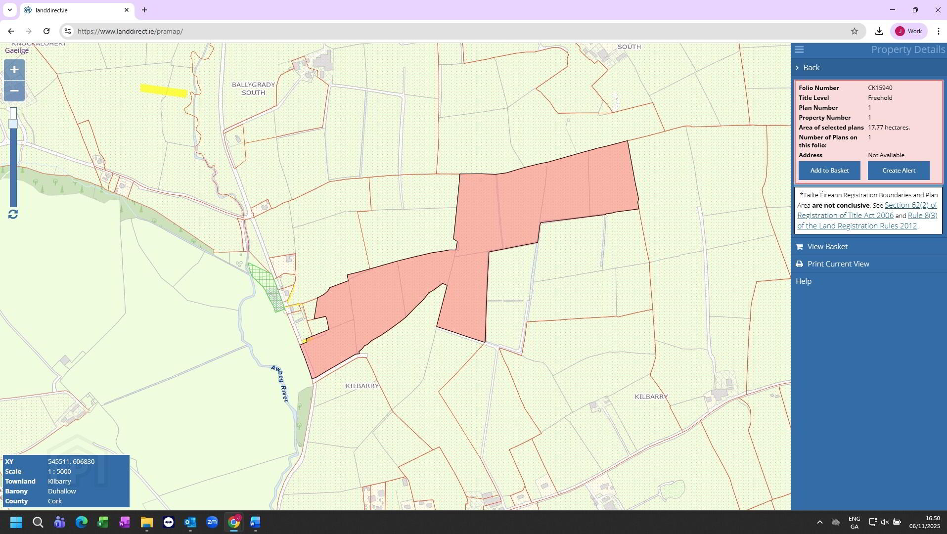 These lands, comprised in Folio CK15940, extend to approximately 43.9 acres (17.77 hectares) and are situated along the L1049 local road, just a short distance from the village of Kilbrin, in North Cork.