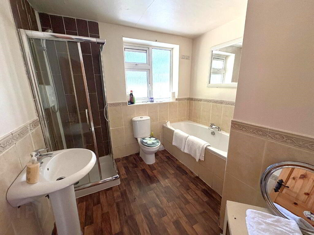 Bathroom: 2.7m x 2.6m, part tiled with free standing shower, bath, toilet & whb.