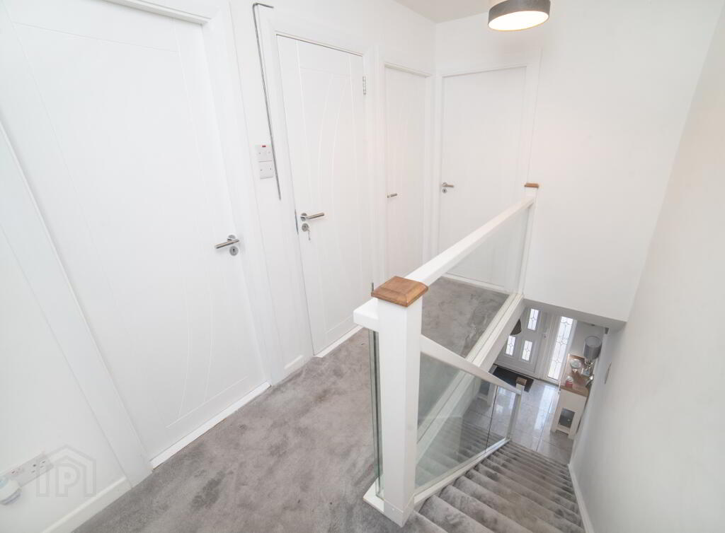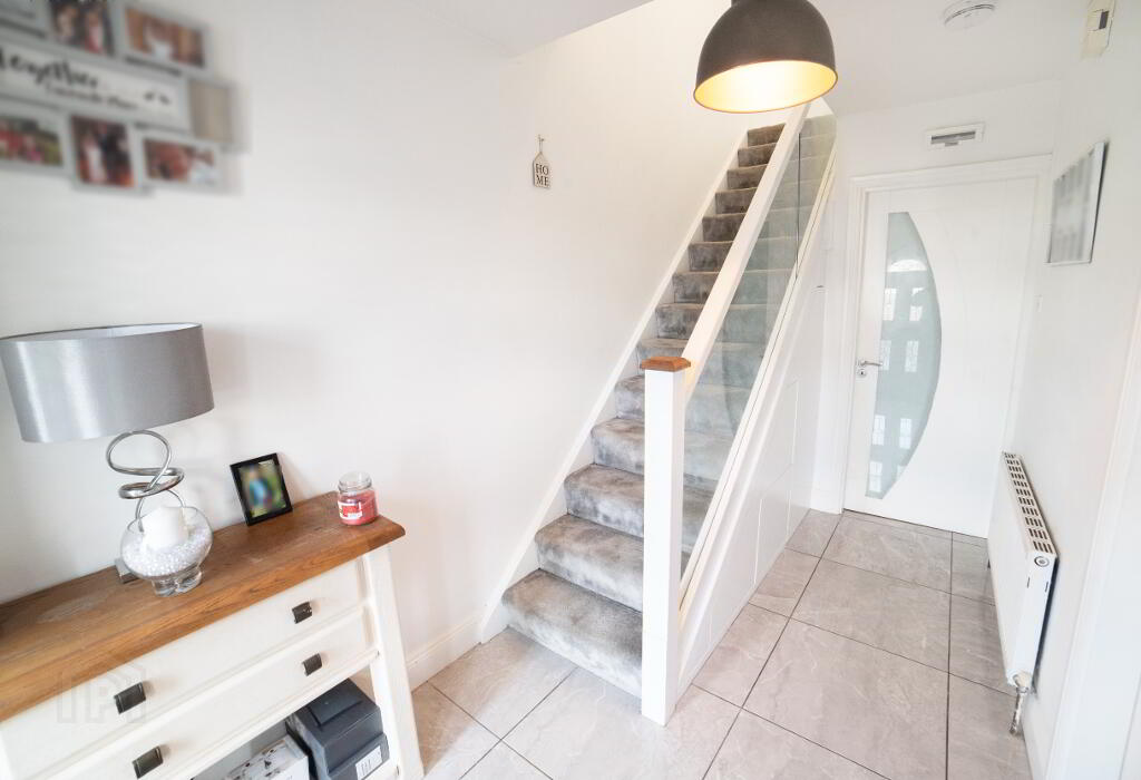 Feature staircase with glass and smart understairs storage, porcelain tiled floor.