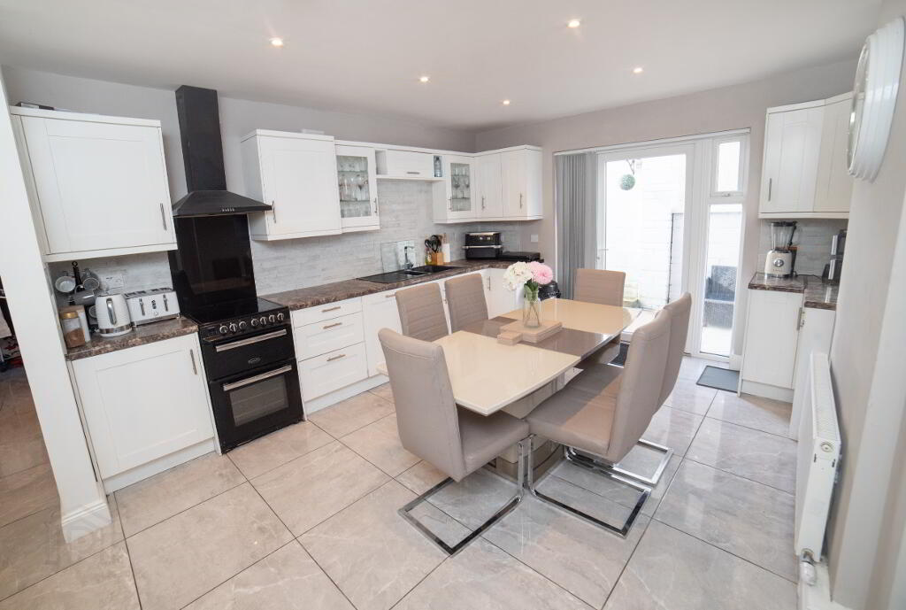 Modern fully fitted kitchen with integrated dishwasher, splashback tiled and porcelain tiled floor, door leading to side of property, recess lighting with led long life bulbs, cooker and American style fridge freezer (plumbed)
