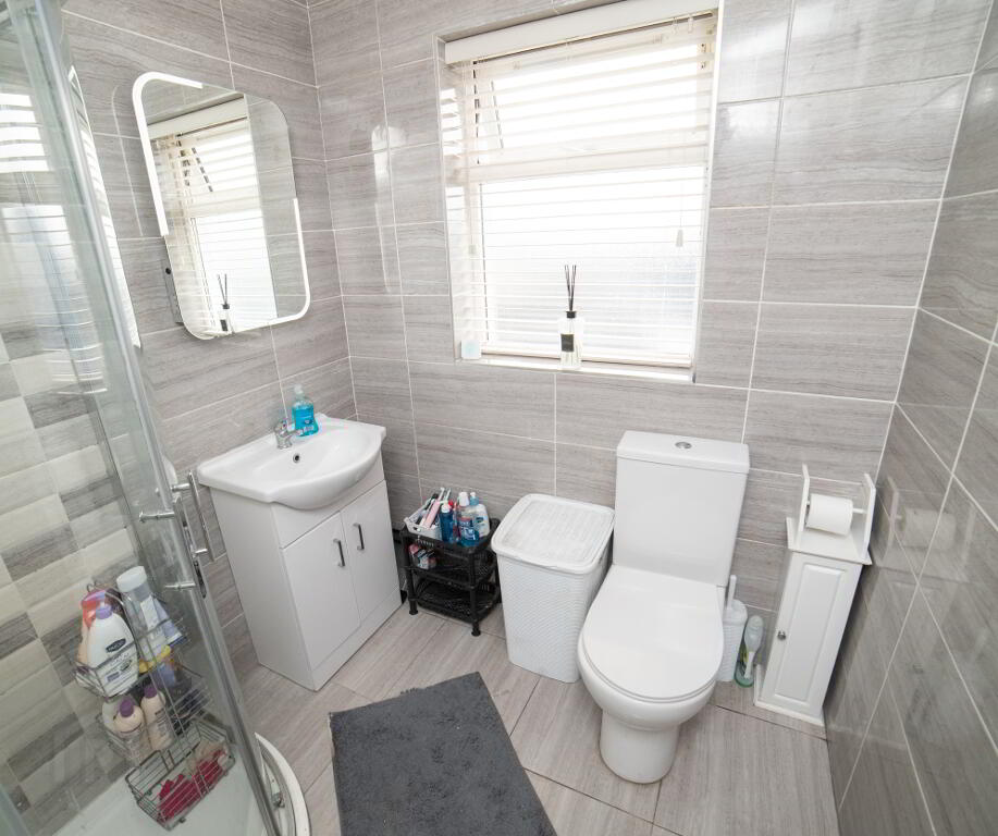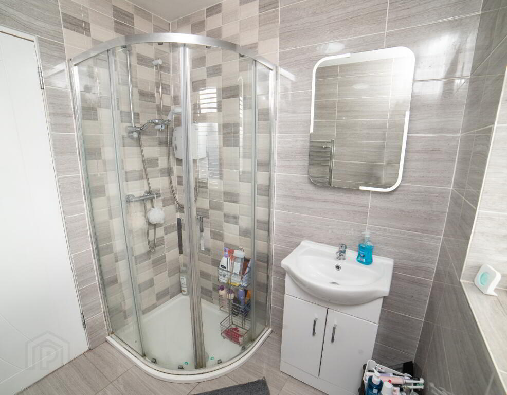 Fully tiled with pumped shower and electric shower, feature led light over w.h.b.