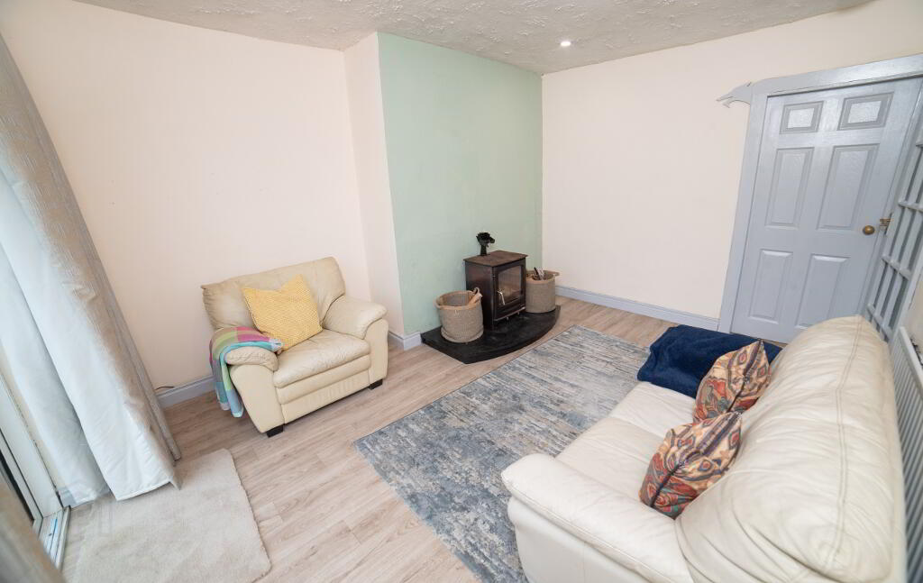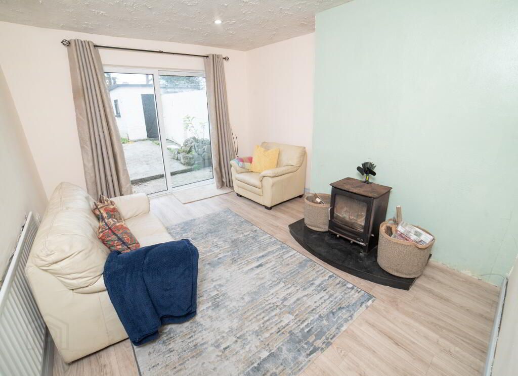 Livingroom: 4.262m x 3.396m with patio door to rear garden, solid fuel stove