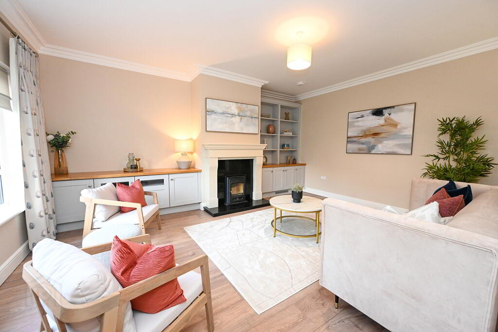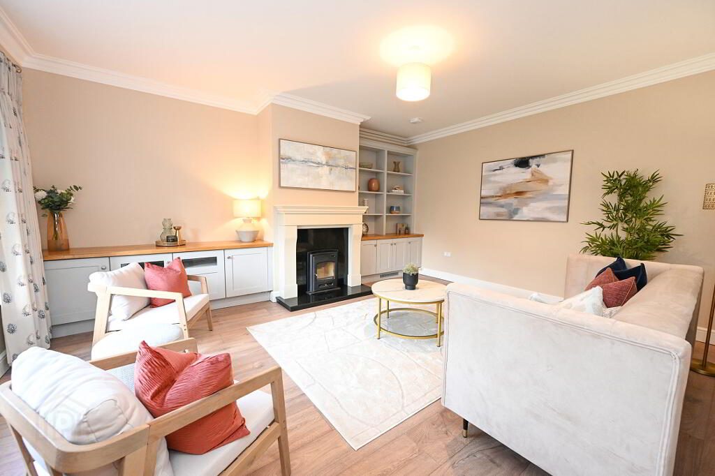 Livingroom: 4.36m x 5.23m with feature fireplace with insert stove and fitted units, swiss krono timber flooring, feature coving