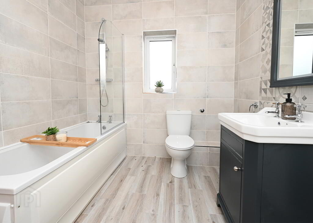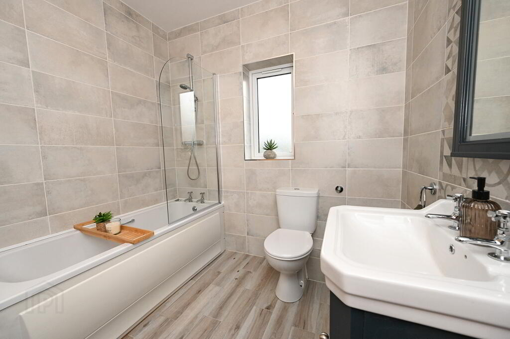 Family Bathroom: 2.57m x 2.37m fully tiled wall and floor, with feature sink unit