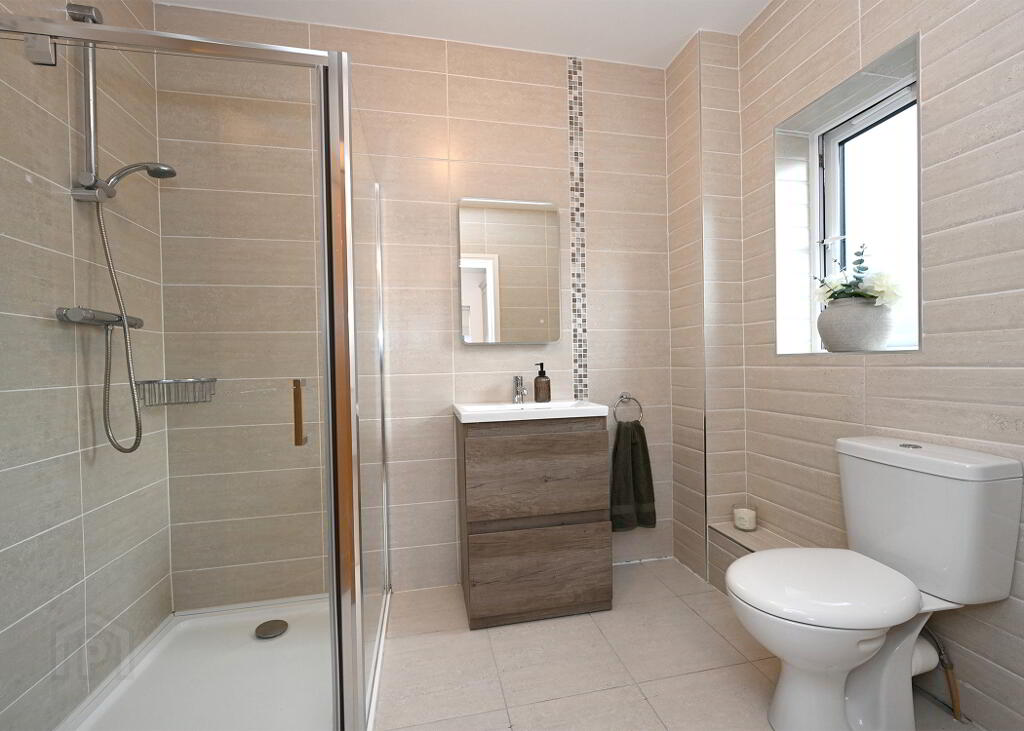 En-Suite.1.69m x 2.15m fully tiled wall and floor in a modern style with led mirror over sink, feature sink unit
