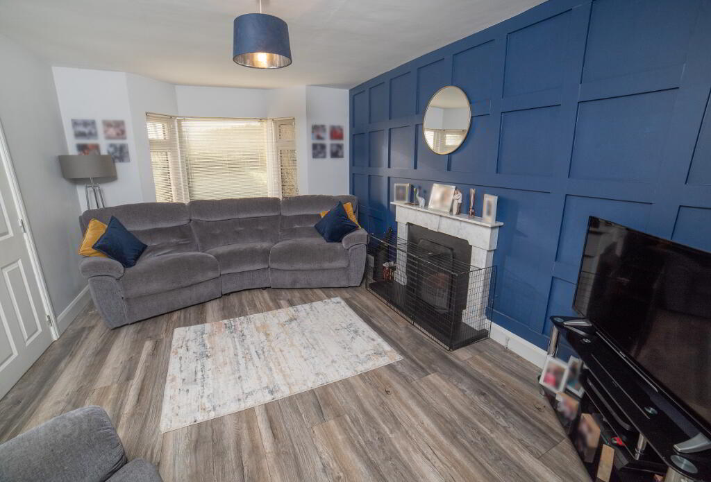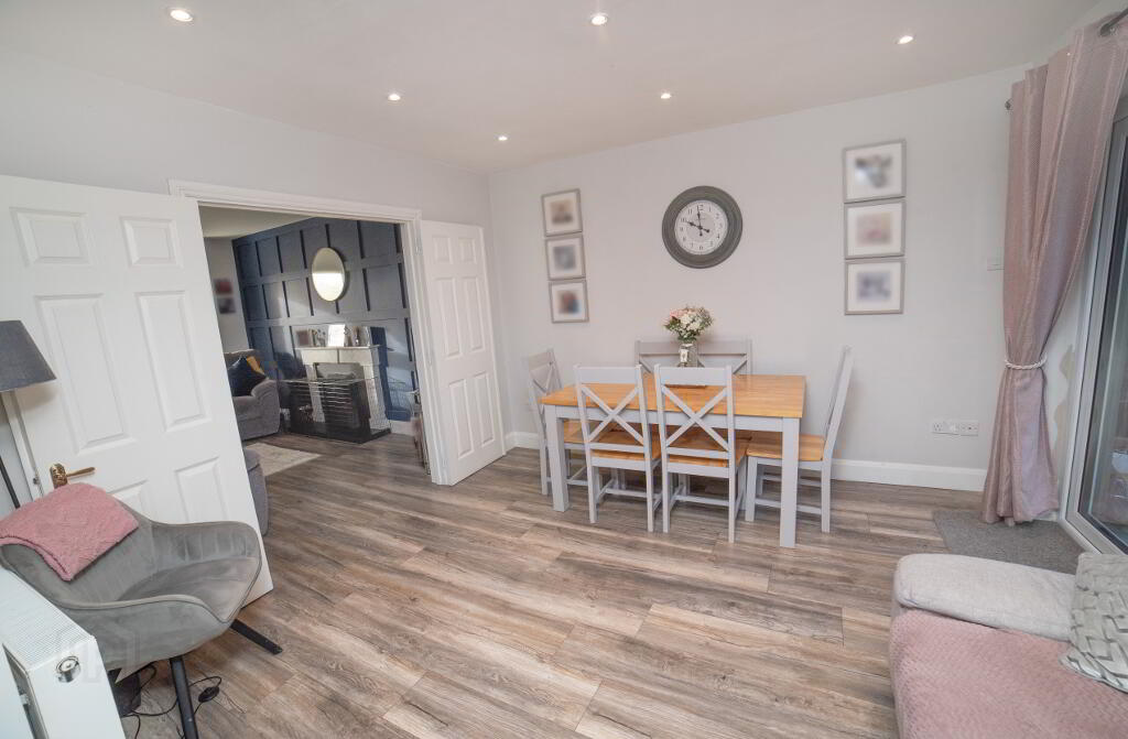 Livingroom: 4.76 x 3.39 with feature panelled wall, open fireplace and laminate wood floor and bay window, leading open plan to both Kitchen and Diningroom 3.63 x 3.39 with laminate flooring, patio door to rear garden