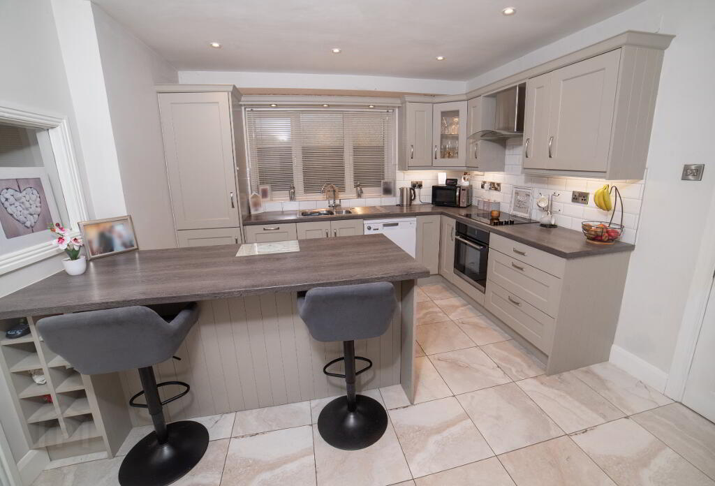 Modern fully fitted kitchen with integrated oven, hob and feature island unit, tiled floor and splash back