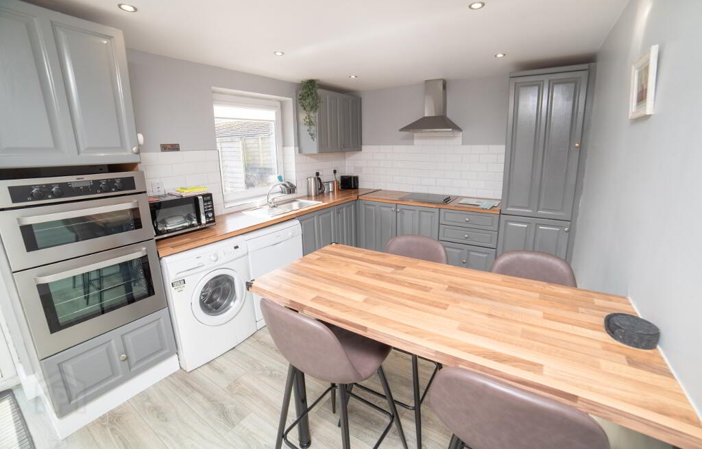 Kitchen/Diningroom: 17’2” ( 5.26m ) x 9’4” ( 2.87m ) fully fitted kitchen with integrated oven, hob and fridge freezer, plumbed for dishwasher, recessed lighting, subway tiling on wall, patio door to rear garden off dining area. Breakfast Counter fitted.