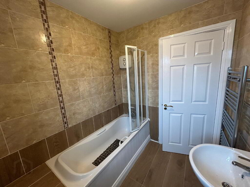 Fully tiled walls and floor, electric shower over bath, and heated towel rail.
