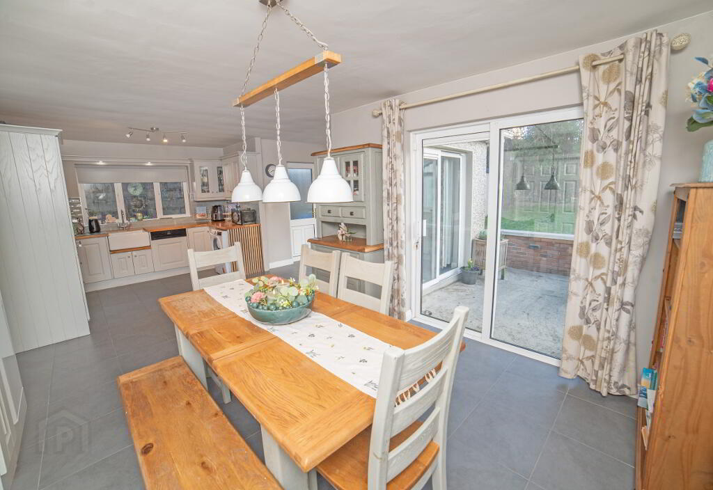 Kitchen/Dining room 23’11” ( 7.31m ) x 12.0” ( 3.68m) open plan modern fully fitted kitchen with integrated oven, gas hob, dishwasher, fridge freezer, Belfast sink fitted with oak worktop and tiled splashback, floor tiled, off dining area patio door leading to rear garden and patio area, an additional patio door leads to rear garden off utility area.