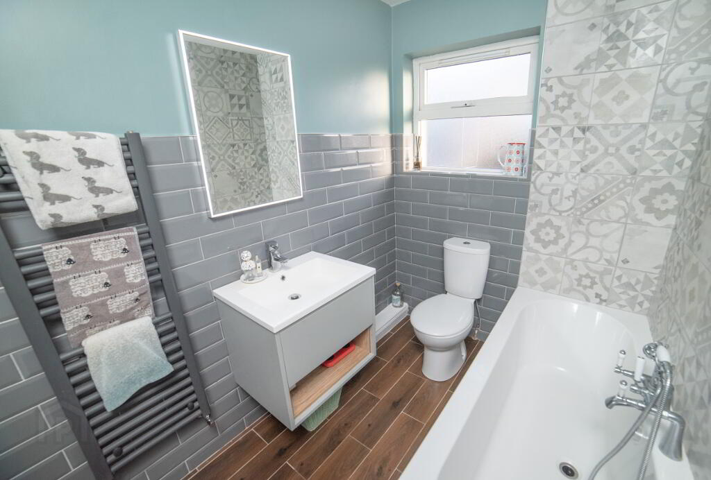Bathroom: 5’5” ( 1.66m ) x 7’3” ( 2.22m ) newly remodelled with led mirror, wall mounted vanity unit with soft close doors, heated towel rail tiled wall and floor